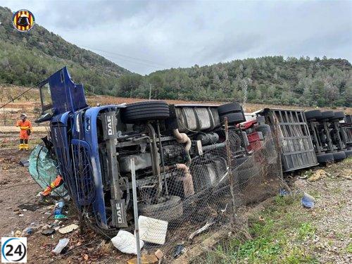 Un camionero resulta herido al volcar en la CV-50 en Alzira, Valencia.