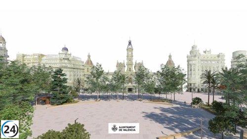 València transforma su plaza del Ayuntamiento con un espacio elíptico para la 'mascletà' y un pavimento inspirado en fuegos artificiales.